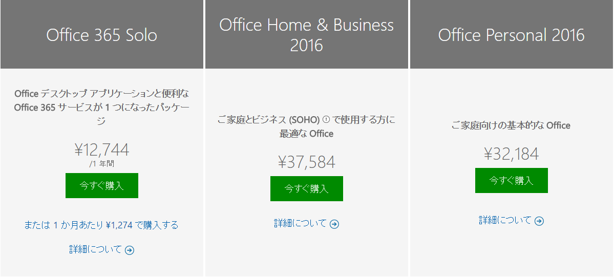 | 価格 | Office 365 Premium 価格:¥ 7,900/1 年間(Win10mall) | Office 365 Solo価格:¥ 12,744/1 年間(Microsoft Store) |